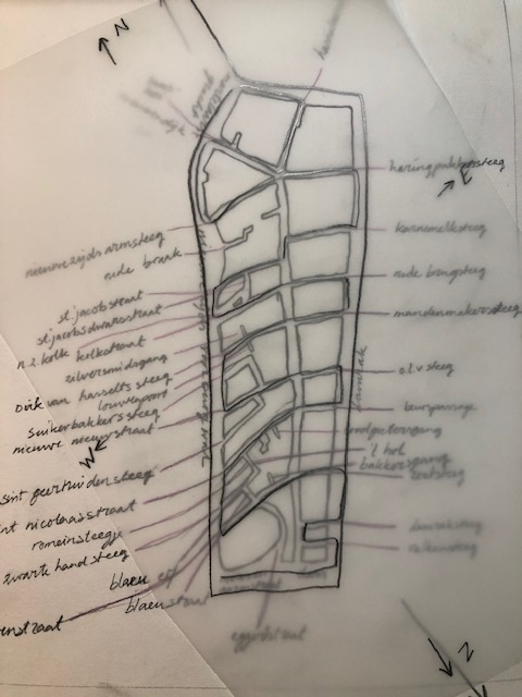 I am writing a letter, I chalk it on the sidewalk – there, where all the passengers pass-by, they come to ‘read’ this city – to read it’s map – it’s history – (an immense migration cue how long can this go on) – it’s history – an immense migration cue – those who are at the rear – try to look over the shoulders of those who are in the front – Curious – envious – patient – thousands and thousands of people from all over the world – are invited to join their gazes – upon these ancient bricks – these ancient muddy waters – paintings – sculptures – churches – palaces – workman-houses – mills – flowers – trees – cheese – waffles – pancakes – burgers – fries – sneakers – gadgets – catch-gets – must-haves – souvenirs – snap -shots – gathering – hunting – hunter & gatherer still present in these contemporary chase of… of what? Of beauty? Glory? Leisure? Art? Culture? Entertainment?