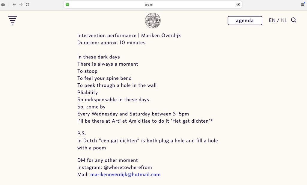 These pages were created as a trace of my idiosyncratic Performance Research Practice as an Urban Choreographer, in search of unnoticed poetry in our everyday reality. An online visit, as my studio space is a street on the canvas of the city, here virtually depicted somewhere on the World Wide Web. It is presented by a menu; browsable, scrollable and skippable. As Gretchen told Hans: ‘We’ll find our way…’