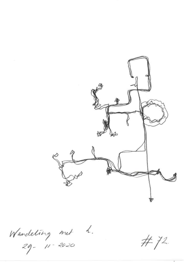 Overdijk seduces these guests into giving her a glimpse of a seemingly unspectacular ritual of the human body that gets up every day, time after time, to participate in the daily routine. In the sound fragment, fragments of this daily ritual shared by the passer-by are made audible. Like an invisible mimography of what goes on behind the facades of the city. During the conversation, the descriptions of this route are followed as closely as possible with a pencil on paper and made visible by walking along in this way. Here you can also see one of the letters that Overdijk subsequently wrote to this co-occupant, with the blueprint of the house walk she drew, transformed into a score on paper.